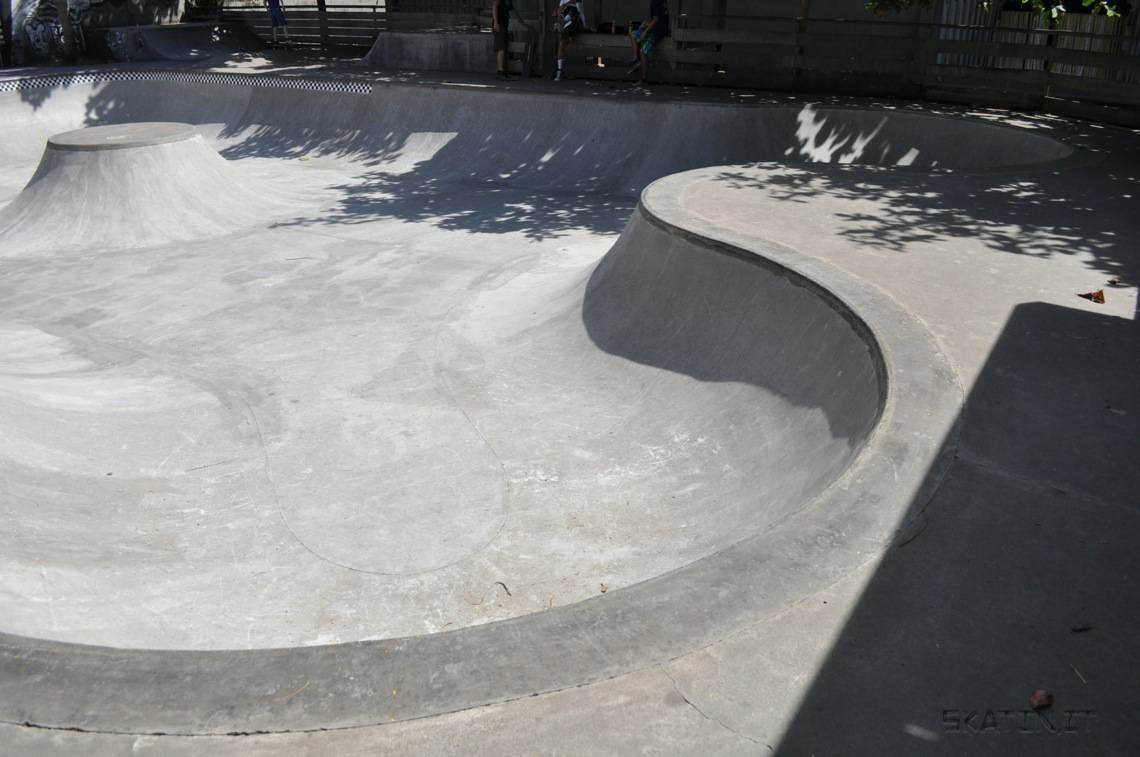 It features a medium sized kidney bowl with a beautifully lazy transition. The shallow end has squarish corners and is about 3ft, while the deep end is 5-6ft. The rest of the park is made up of fun little quarters, minis, ledges and rad little banked hip. There’s even a see-saw! But what makes this park so awesome is that the surface is smooth and fast, the coping is set perfectly and the overall design is well thought out. There is so much to do here from just cruising around the bowl, shredding the mini’s or going rally fast around the street section. Just awesome!