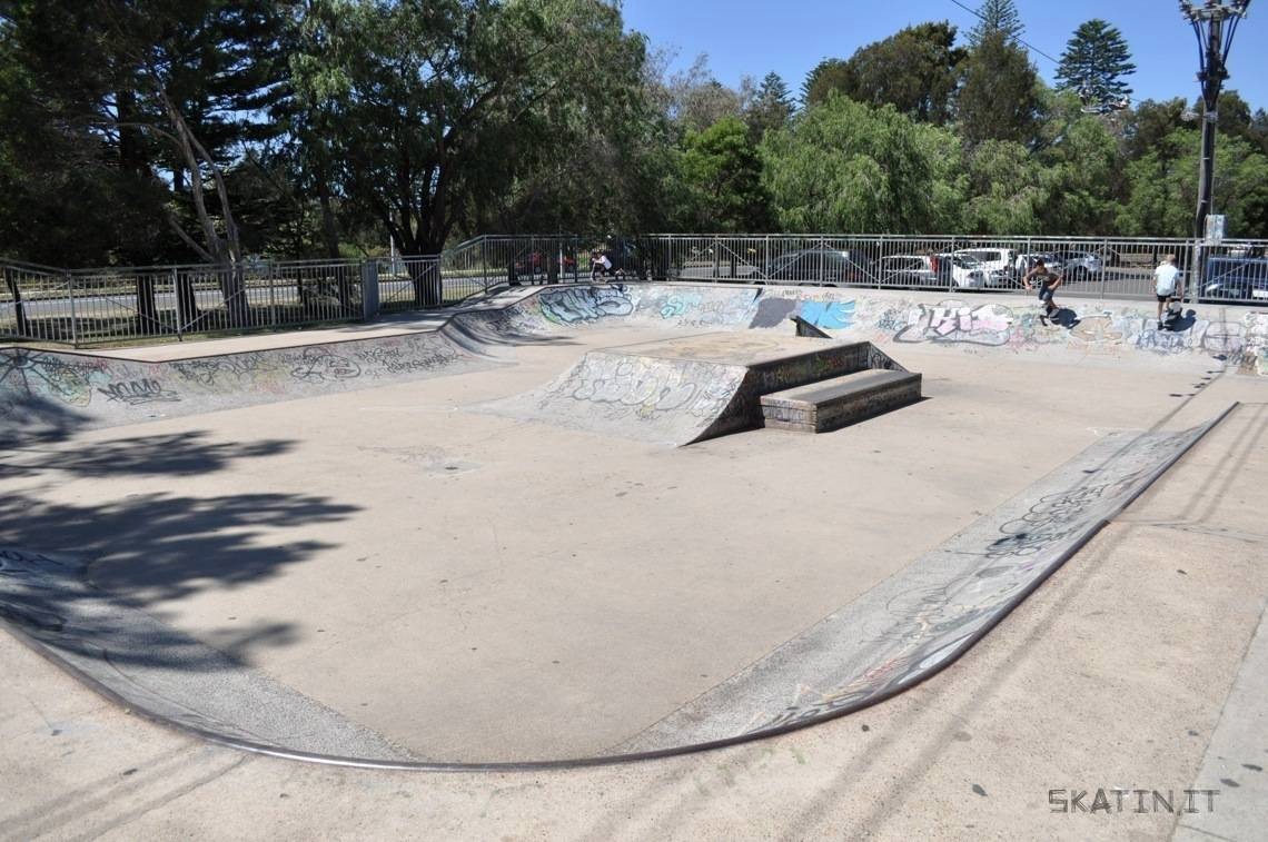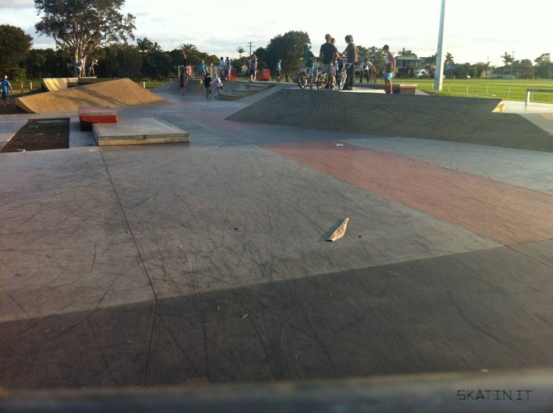 Old school historic skatepark featuring a small open cement mini bowl with a central funbox. Good parking not much seating in the shade so pack a hat. Large open park next door, 10 min walk to beach, no shop nearby, public toilets close by. Lots if local kiddies here friendly but can be chaotic due to the setup and kids coming from all directions.