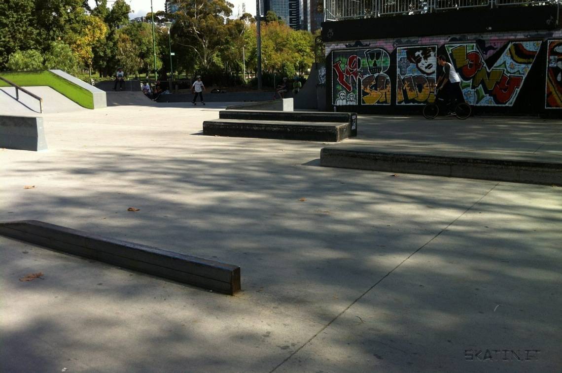 Exiting the bowl will lead you down to a large, open street area that is cleverly filled with all kinds of rampy, streety goodness. It starts with series of banks, transitions, rails and staircases (9 & 6) that lead down to an open flat area full of interesting boxes, pyramids, rails and other oddities. At the southern end is some larger quarters and a 40ft long 3-4ft mini that’s a lot of fun. Scattered around the perimeter there’s even more boxes, edging and kinky little 2ft transitions. Everywhere you turn there’s something to use and the diversity of shapes and sizes means this skatepark is awesome for all skill levels.