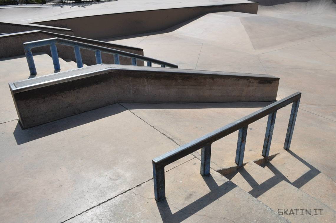 The other section is a simple pre-fab street setup with 6ft roll-in that runs onto a stupidly steep funbox and rail. This leads up a second level with another small bank that enters the bowl. All very confusing… and kind of big and odd.
